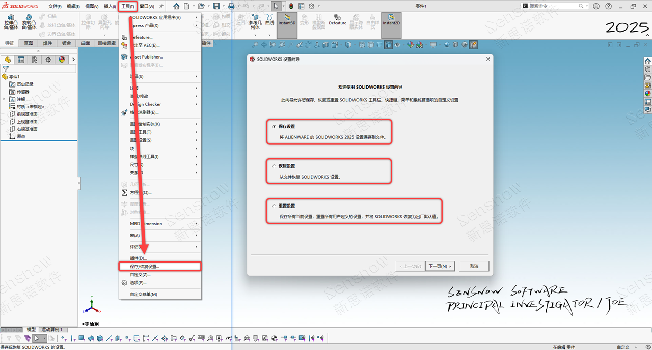 使用“保存/恢复设置”的方式将同事计算机中的 SOLIDWORKS 设定进行保存,并拿到当前有问题的计算机中使用相同方式导入设置。