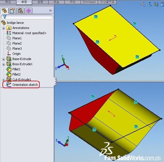 我们发现,上图中的零件与一般的零件没有显著区别,对比图一和图四,图四零件的特征库中没有出现成型工具特征,但是有两个地方值得我们注意,第一即是特征库中存在一名为Orientation sketch的草图(见绘图区域的黑色轮廓线),第二个是此零件的侧面颜色为红色(其他面均为黄颜色,此黄颜色的存在对成型工具的生成没有任何影响,可以将其颜色删除),其实,这正是问题的关键,Orientation sketch的草图(可以用原模型边线转换实体引用得来,草图命名无要求)即为用于钣金成型的定位草图,而成型工具如果有切除的特征,即将切除的面设定为红颜色(必须为红色)。