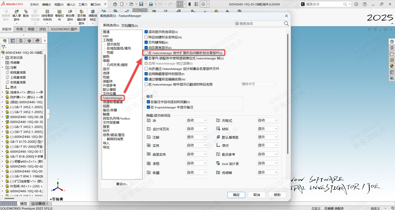 在 SOLIDWORKS 2025 SP 2 版本中为其触发动作增加了一个开关,可实现在我们需要触发的时候开启,在我们不需要触发的时候关闭。现在可在此位置进行访问:选项 -> 系统选项 -> FeatureManager -> 在 FeatureManager 树中扩展时自动解析轻化零部件。