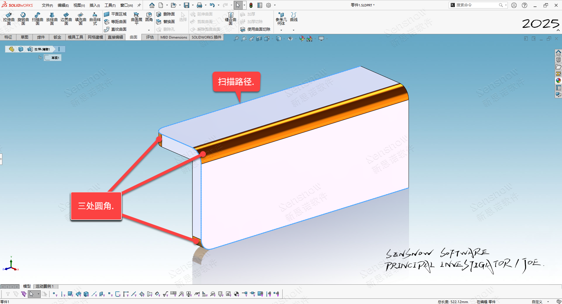 2、制作扫描路径:倒三处圆角,半径为 R10 毫米,由此创建出扫描路径;